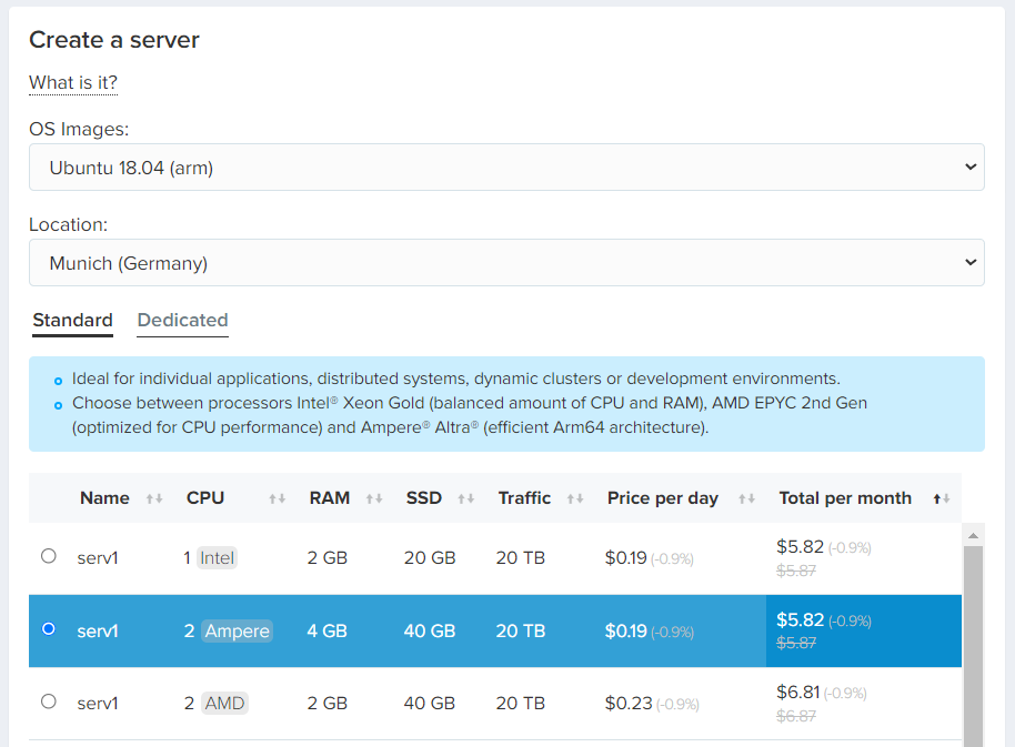Choose between processors Intel® Xeon Gold (balanced amount of CPU and RAM), AMD EPYC 2nd Gen (optimized for CPU performance) and Ampere® Altra® (efficient Arm64 architecture).