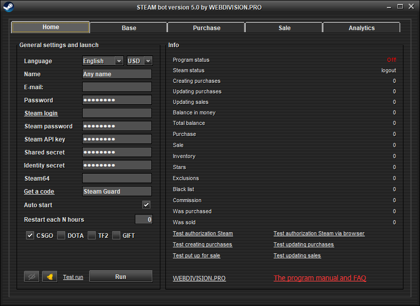 We advise you to run all the tests available in the program before starting. Start by showing what and how the program will buy/sell. Then the test for creating purchases, see the result on the market, then the test update purchases and so on.