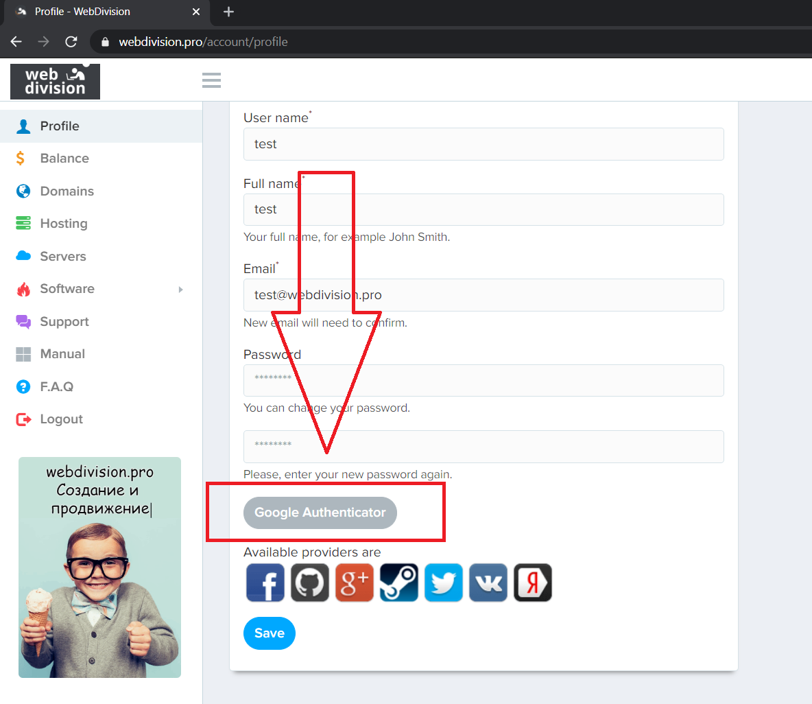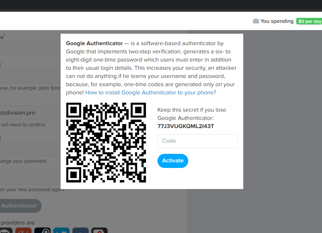 4. Enter a code from Google Authenticator application and push the button Activate.