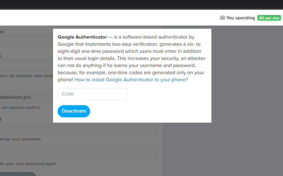 5. For deactivate the 2 step verification, enter a code and push the button Deactivate.