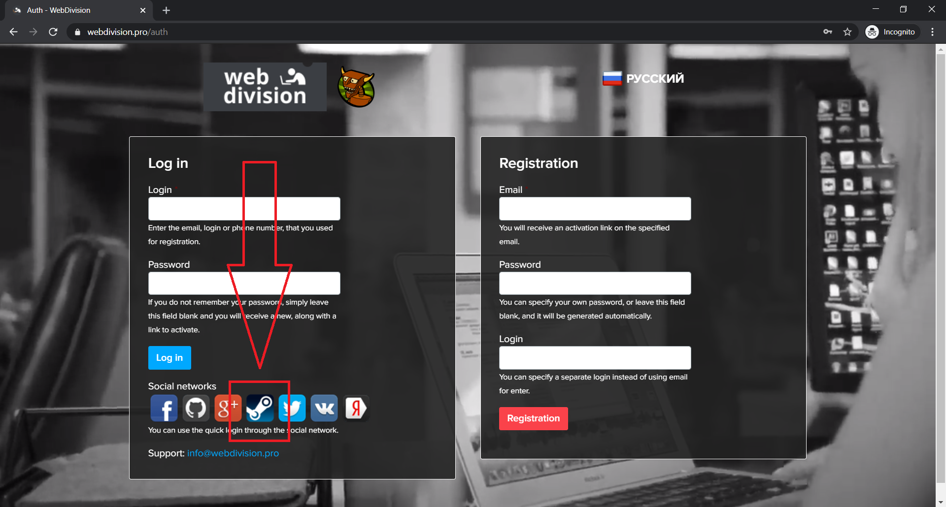 You can register via Steam. Just click the icon of Steam. If you are already registered then you can attach your account Steam in your profile webdivision.pro/account/profile for quick login in.