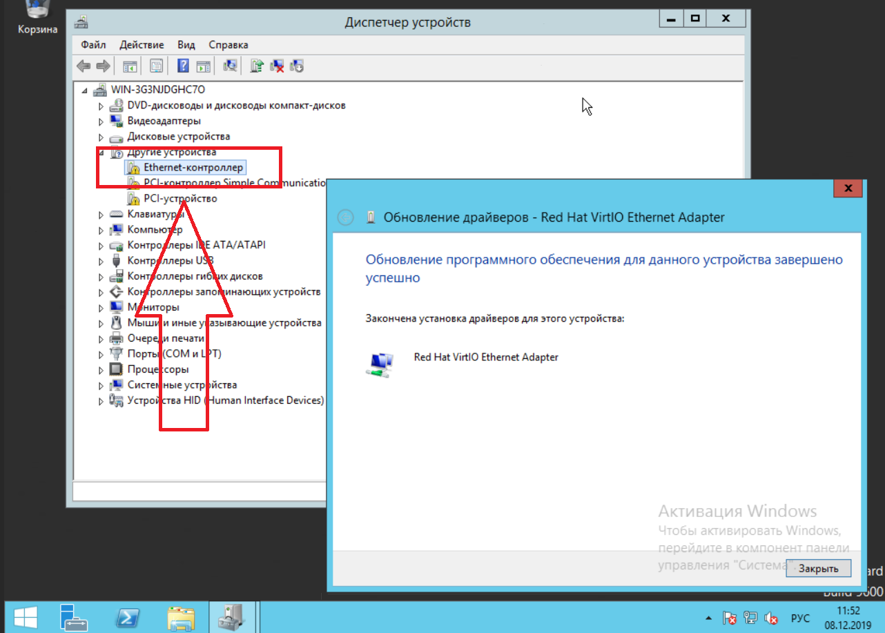 Answer: You have not installed the network driver. Mount (the same as insert the disk into the drive) VirtIO driver disk as in the instruction Windows installation through Account -> Go to Control Panel -> Device Manager -> Right-click on an uninstalled driver -> Update driver -> Find driver manually -> Specify the path to the mounted disk with VirtIO drivers -> Install the driver. Do the same for all drivers not found.