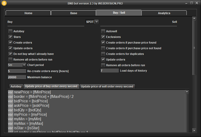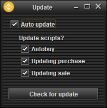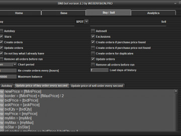 There is no logic in the program, so you can easily write your own logic for buying, updating buy orders and updating the selling price, which makes the program unique for each user. The program has three scripts (logics):