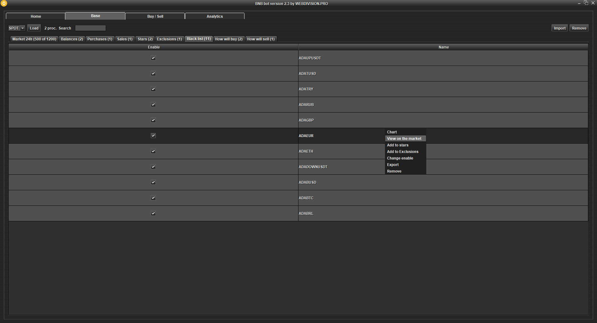 Table Blacklist - this is a table of cryptocurrencies that you want to ignore and never buy! The Black List is always more priority than the Favorites, that is, if you add the cryptocurrency to Favorites and the Black List, then the cryptocurrency in the Favorites will not work!