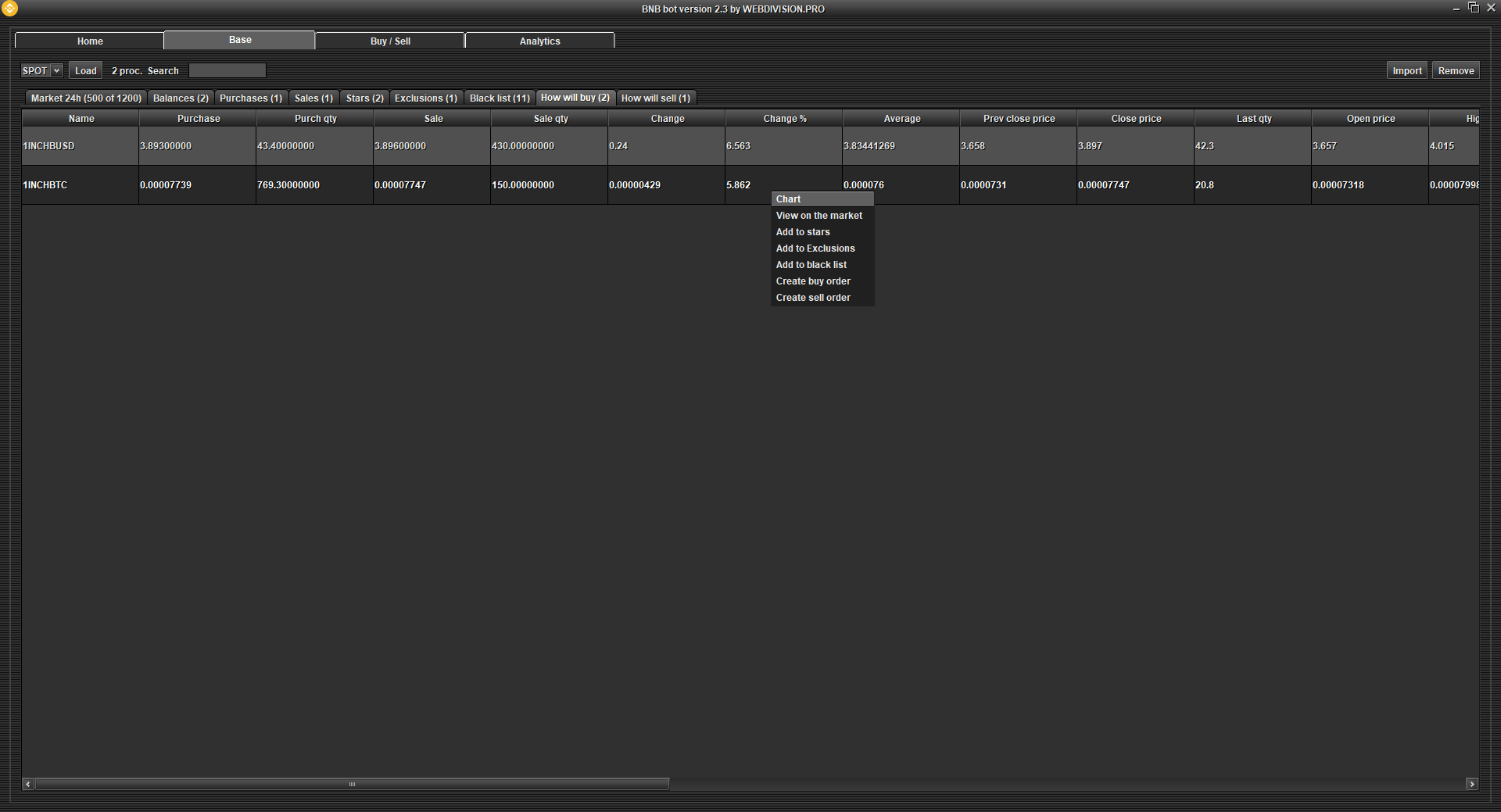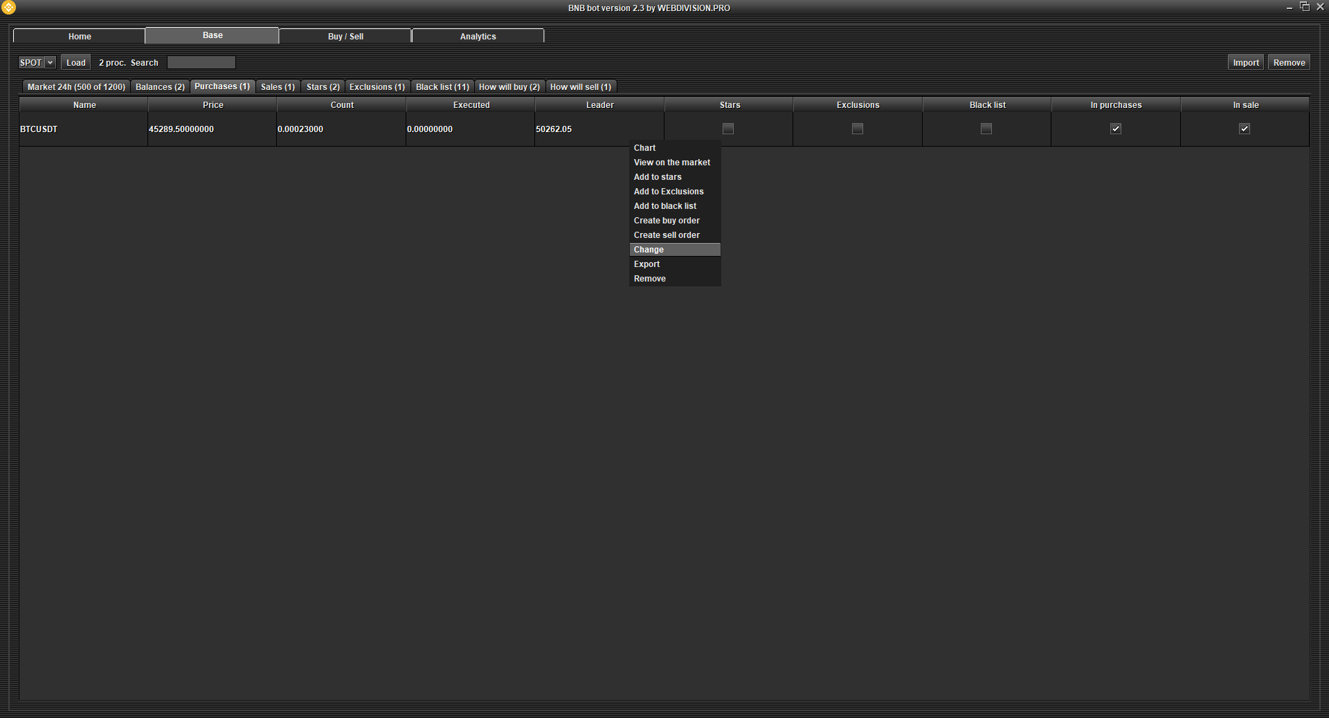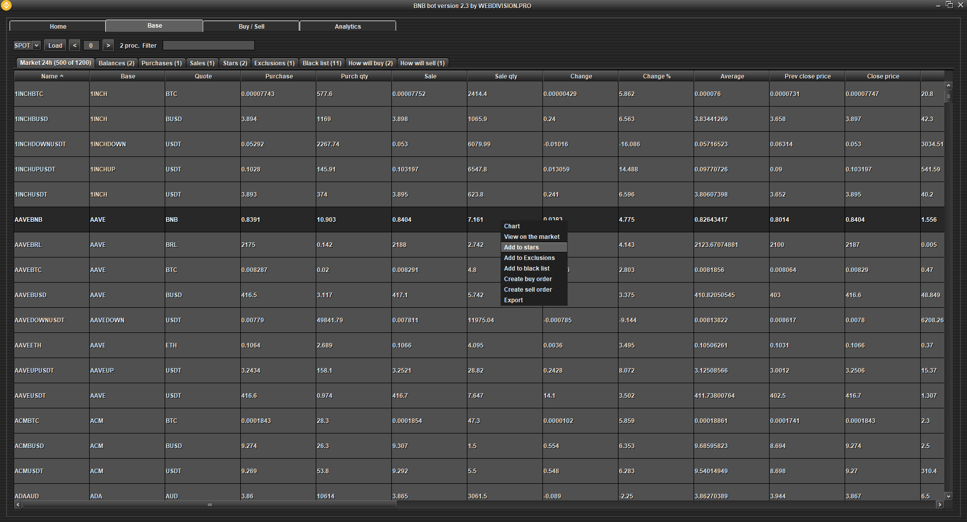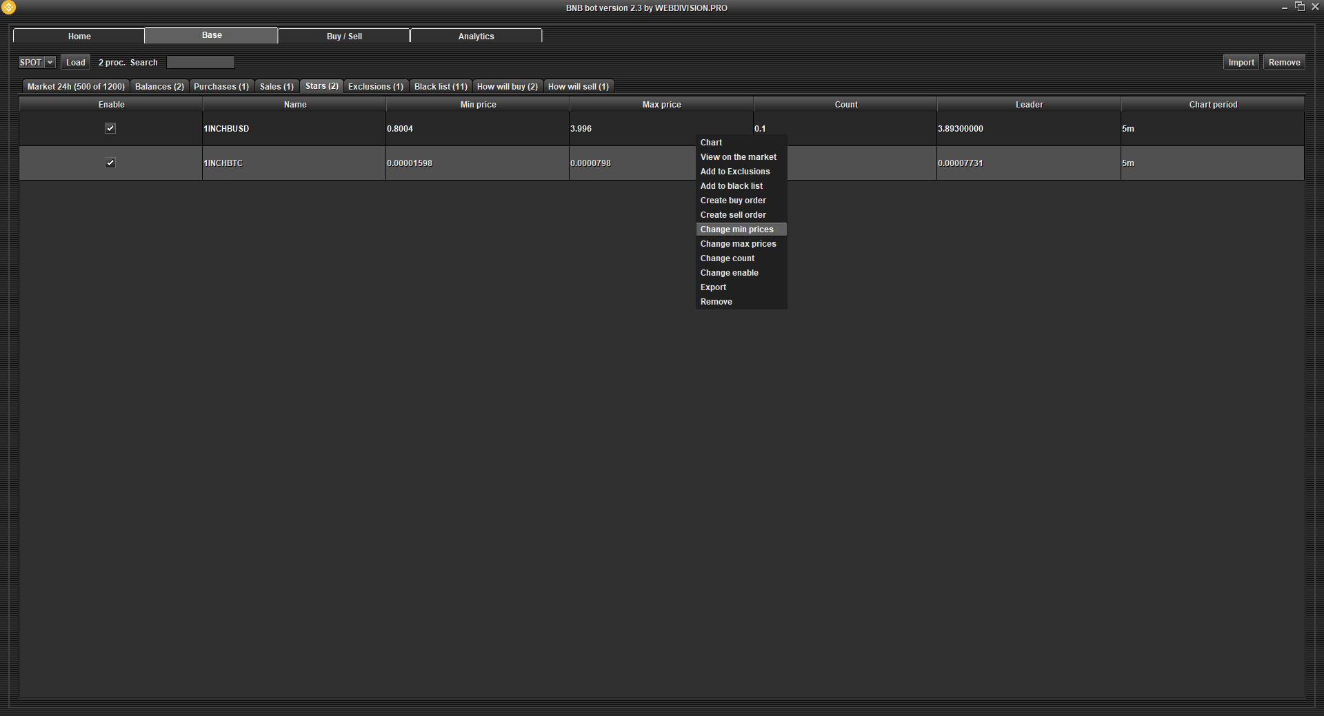 Stars - the program will create orders for the purchase of cryptocurrency, which are added to the Stars table. Turn off AutoPurchase if you only need to buy the cryptocurrencies that you have added to the Favorites table. If you need to calculate min. and max. the price of your Chosen cryptocurrency in a special way, then change the logic in "Updating the purchase price every second".