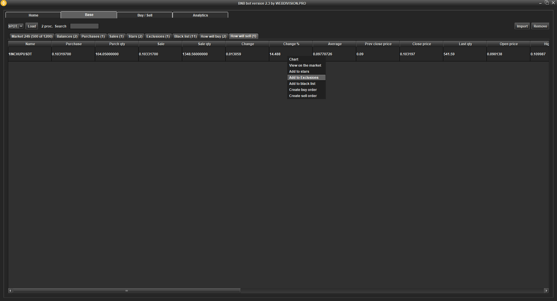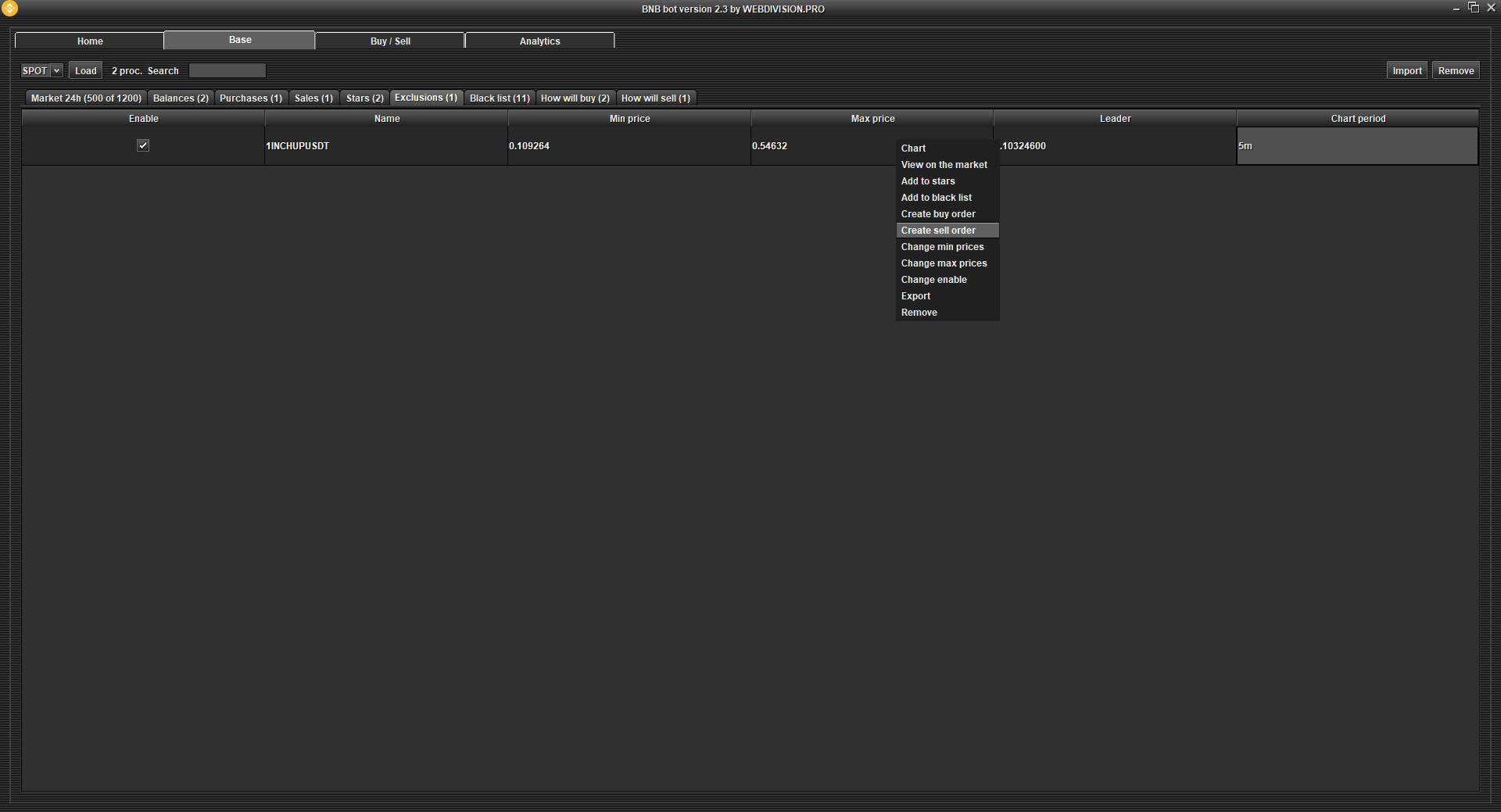 Exclusions - the program will sell cryptocurrencies at the intervals you set. Disable Auto Sell if you only need to sell the cryptocurrencies that you have added to the Exclusions table. If you need to calculate min. and max. the prices of your Exceptions are somehow special, then change the logic in "Updating the sale price every second".