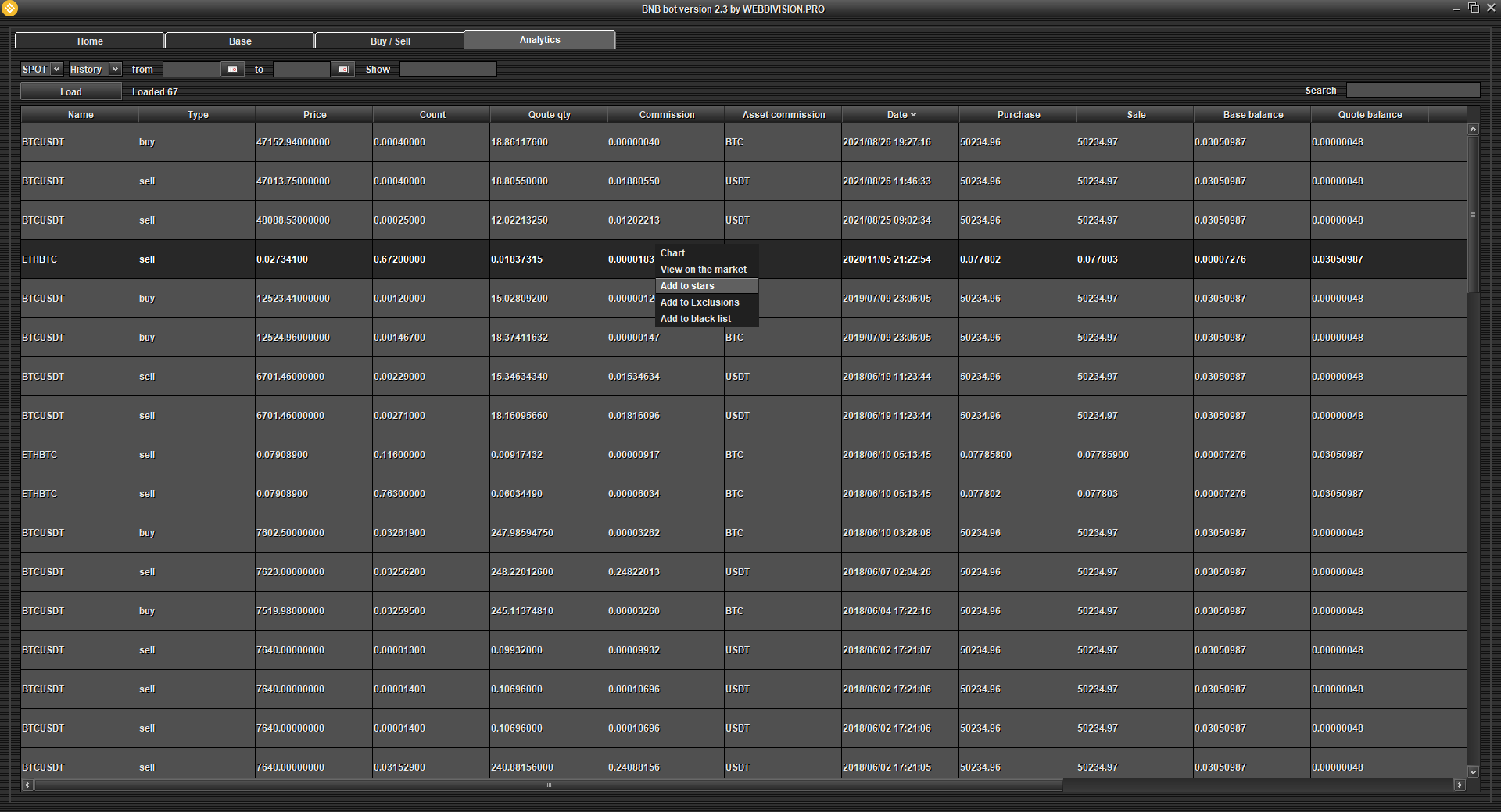 Pop-up menu - select a row or group of rows (CTRL or SHIFT) of the table and right-click to bring up a Pop-up menu where you can, for example, add cryptocurrency (s) to Favorites, Change price (s), Remove/Remove from sale, etc. Each table has its own menu!