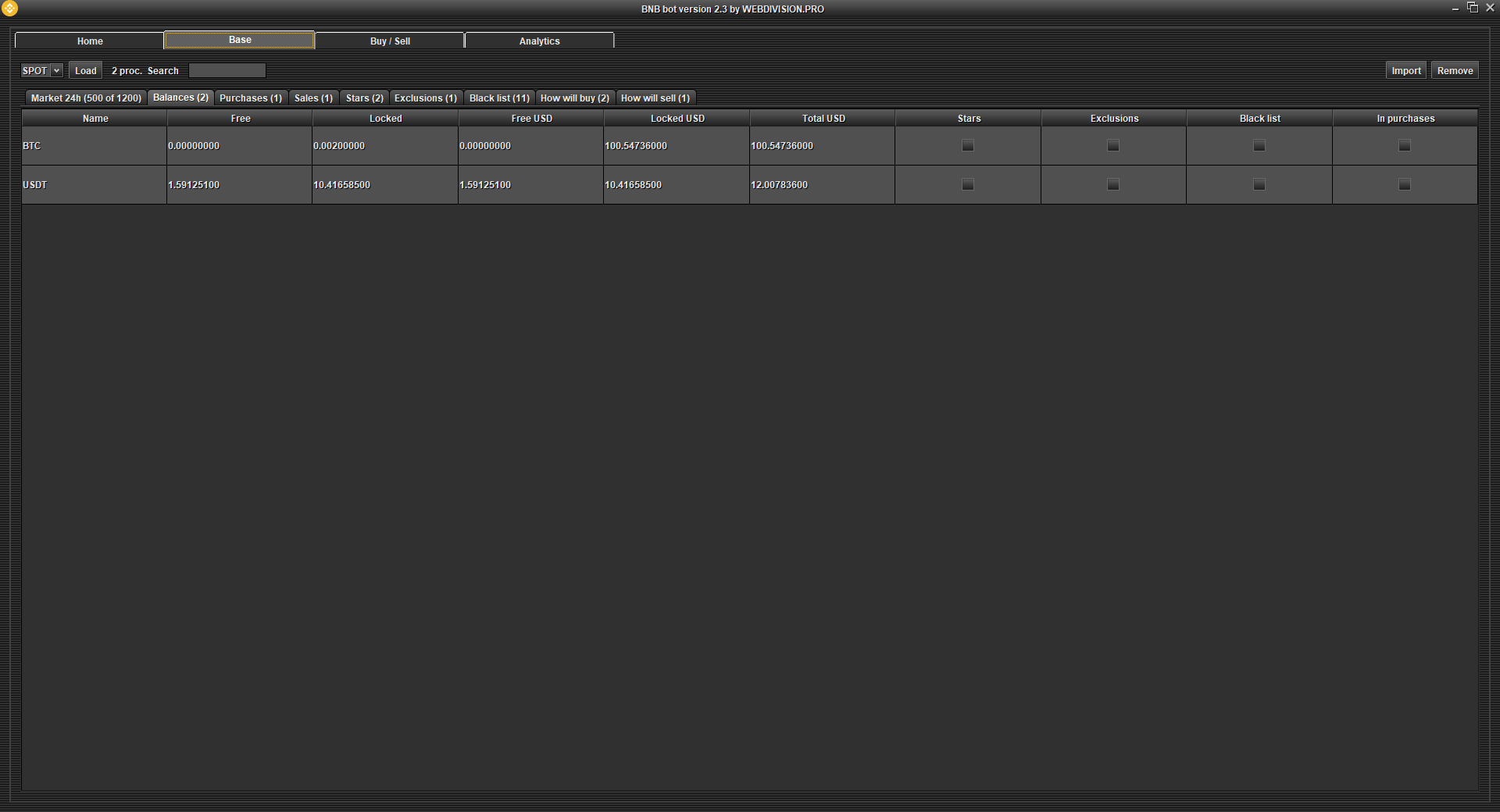 Table Exclusions - this is your base of cryptocurrencies that you want to SELL in a special way. You can specify the minimum price (threshold) and the maximum price (threshold) within which the program will compete (+-1 cent) with other market users! The word Exclusion means that you exclude cryptocurrencies from AUTO SALES, where you can specify your price limits.
