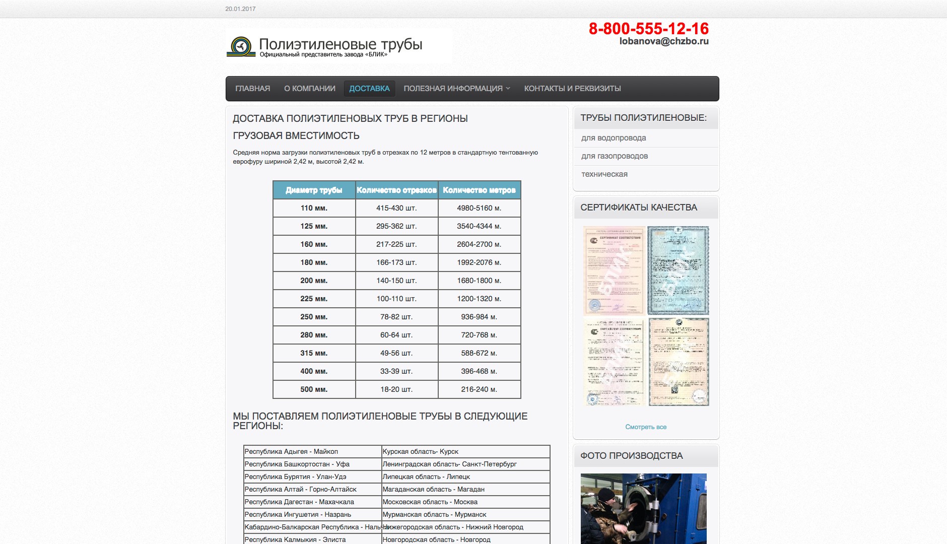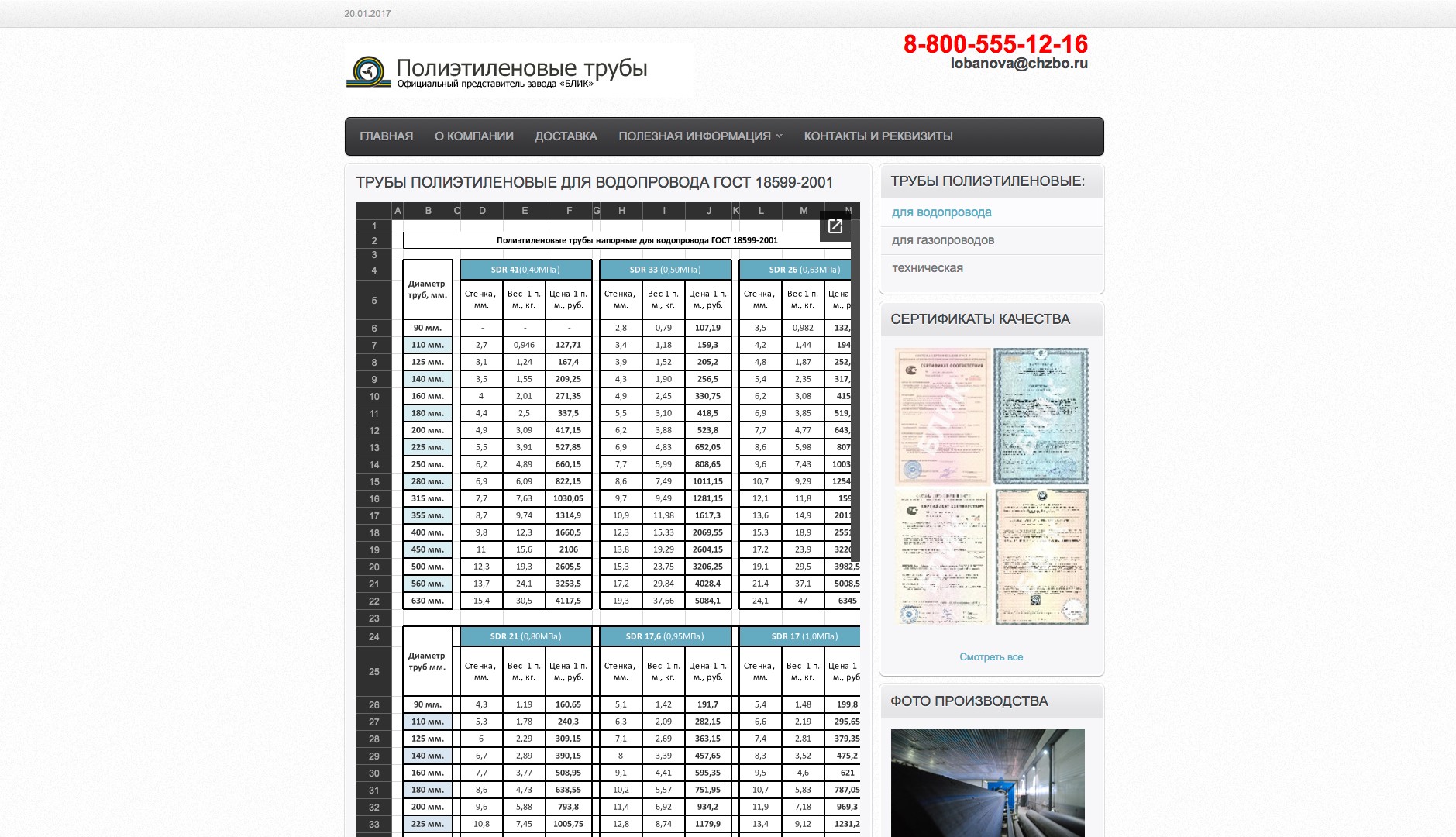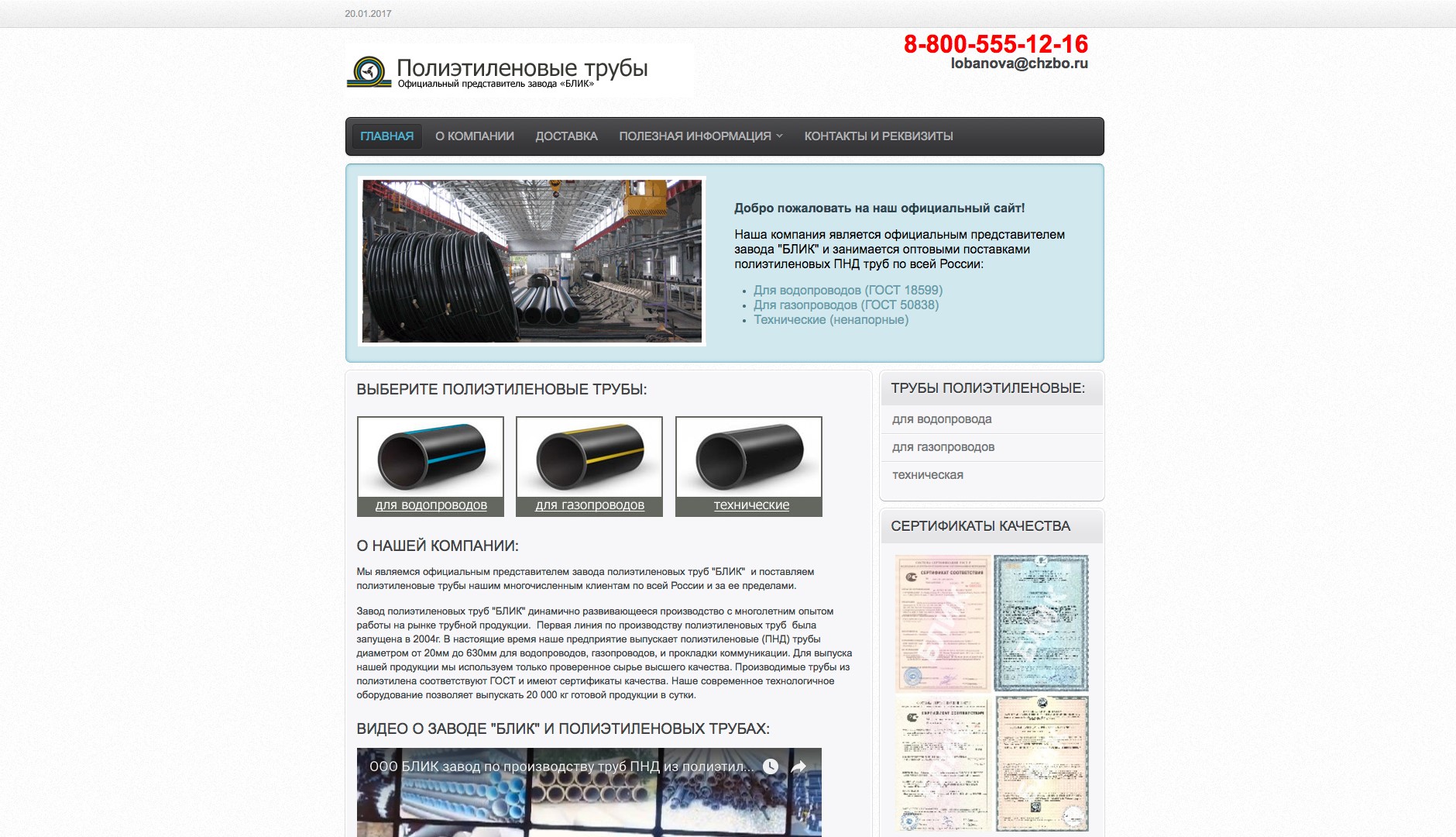 Plant «BLIK» was founded in 1994. Since 2004, specializes in the production of polyethylene pipes. The territory of the plant occupies 500,000 square meters, on which are located three modern German derivative lines with a capacity of 20,000 kg of finished products per day. The plant is one of the three largest polyethylene pipe plants in the CIS.