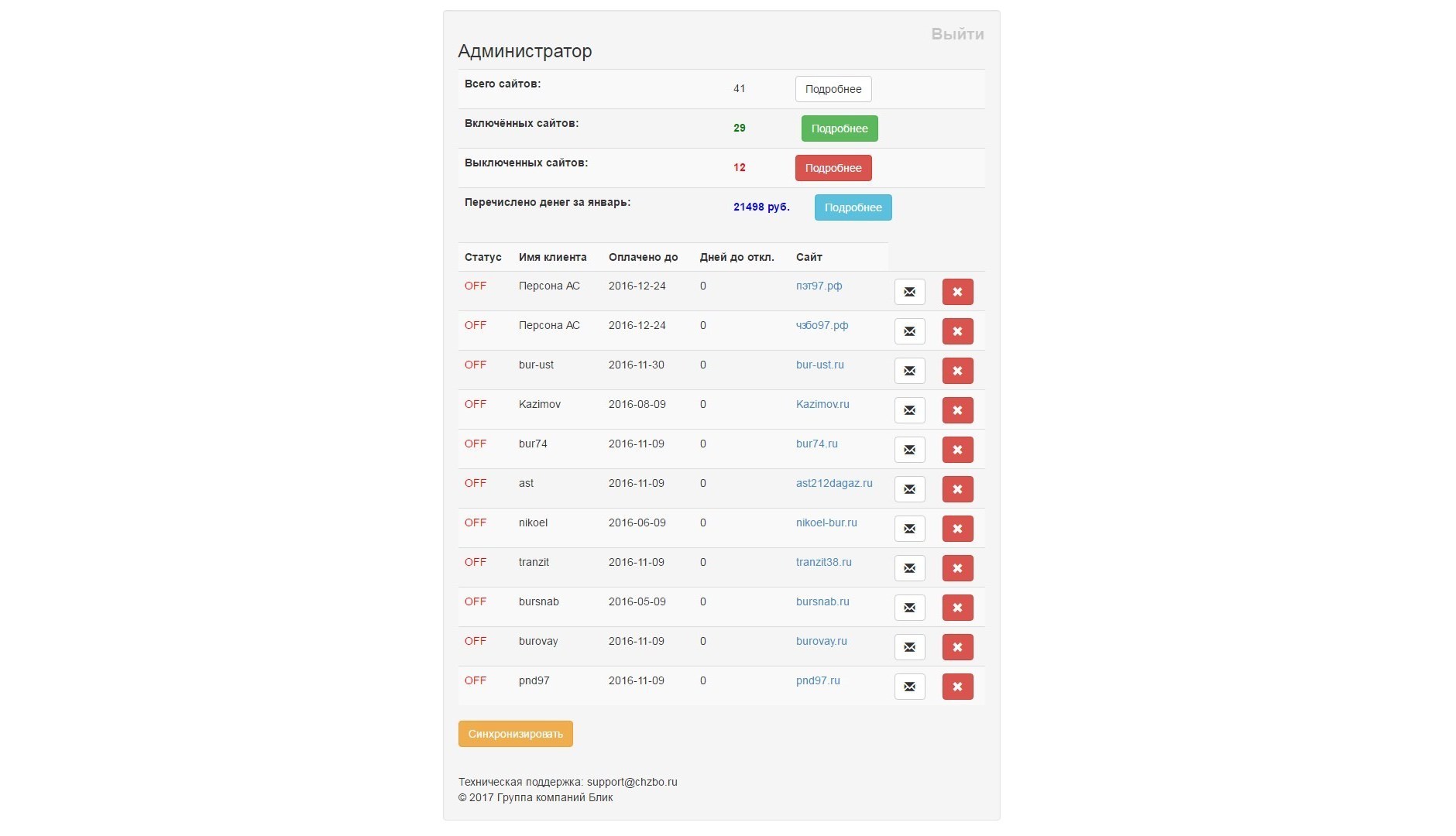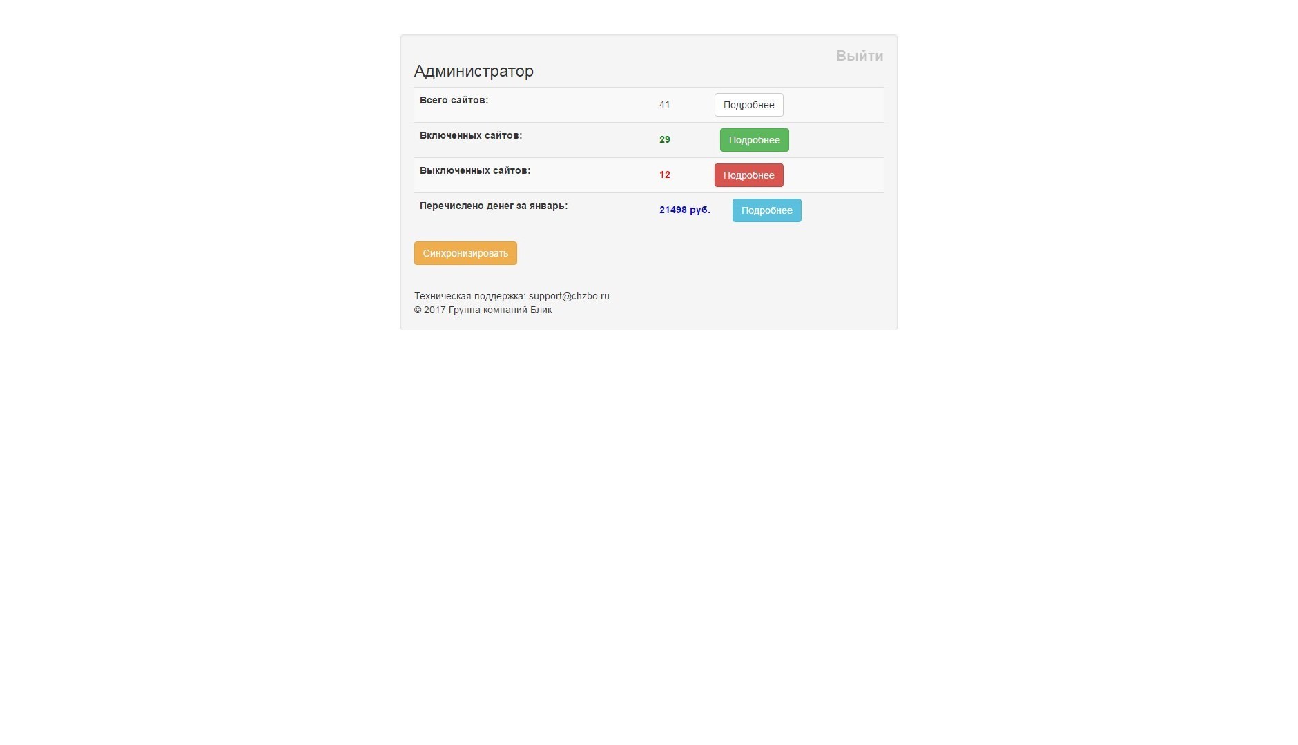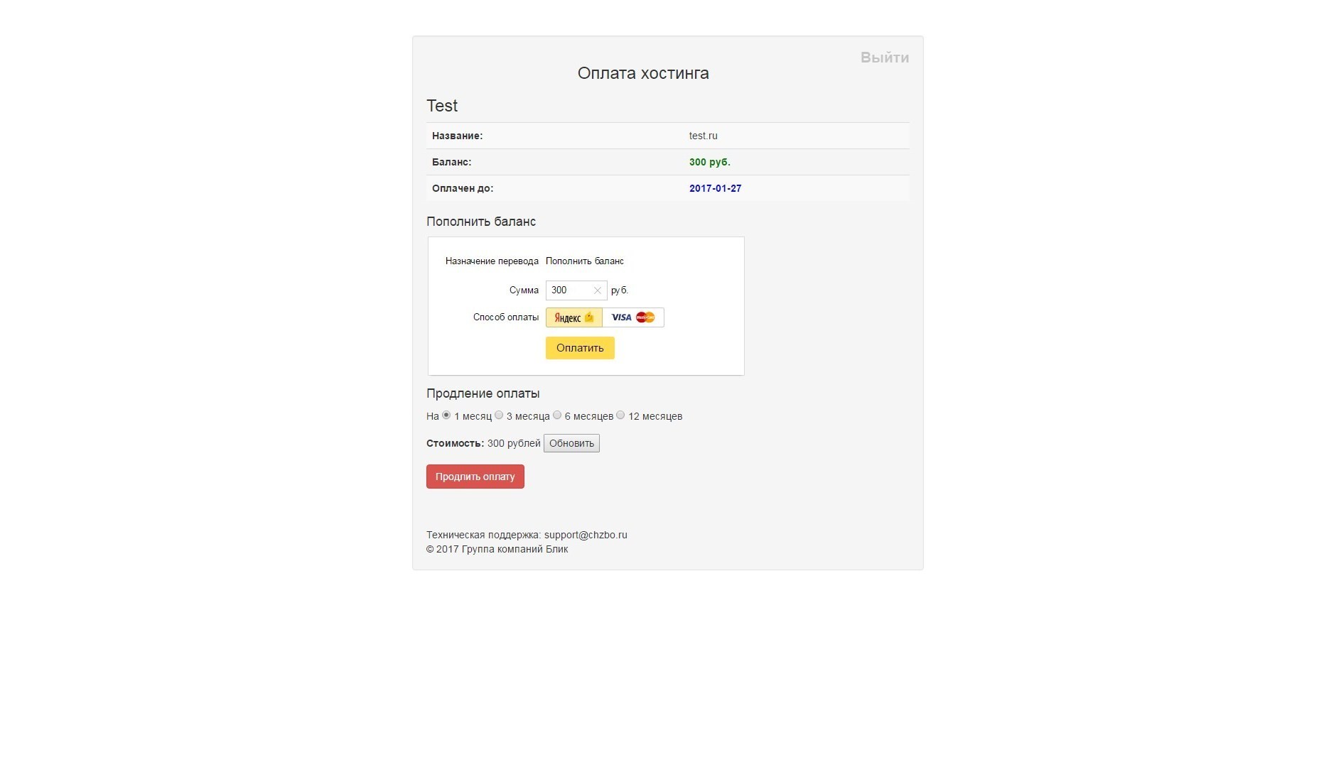 Group of companies Blik. The panel for payment for hosting. A dealer of the Blik group of companies, having authorized, can pay for hosting, through Yandex.Money or a bank card. The system will automatically notify the dealer about the need to replenish the balance or turn off the dealer's site if the positive balance ends. The administrator of the group of companies Blik, can see the number of included / disabled dealer sites, the history of replenishment, send a letter to the dealer or remove the dealer / site from the system. The system automatically notifies the administrator about new replenishments.