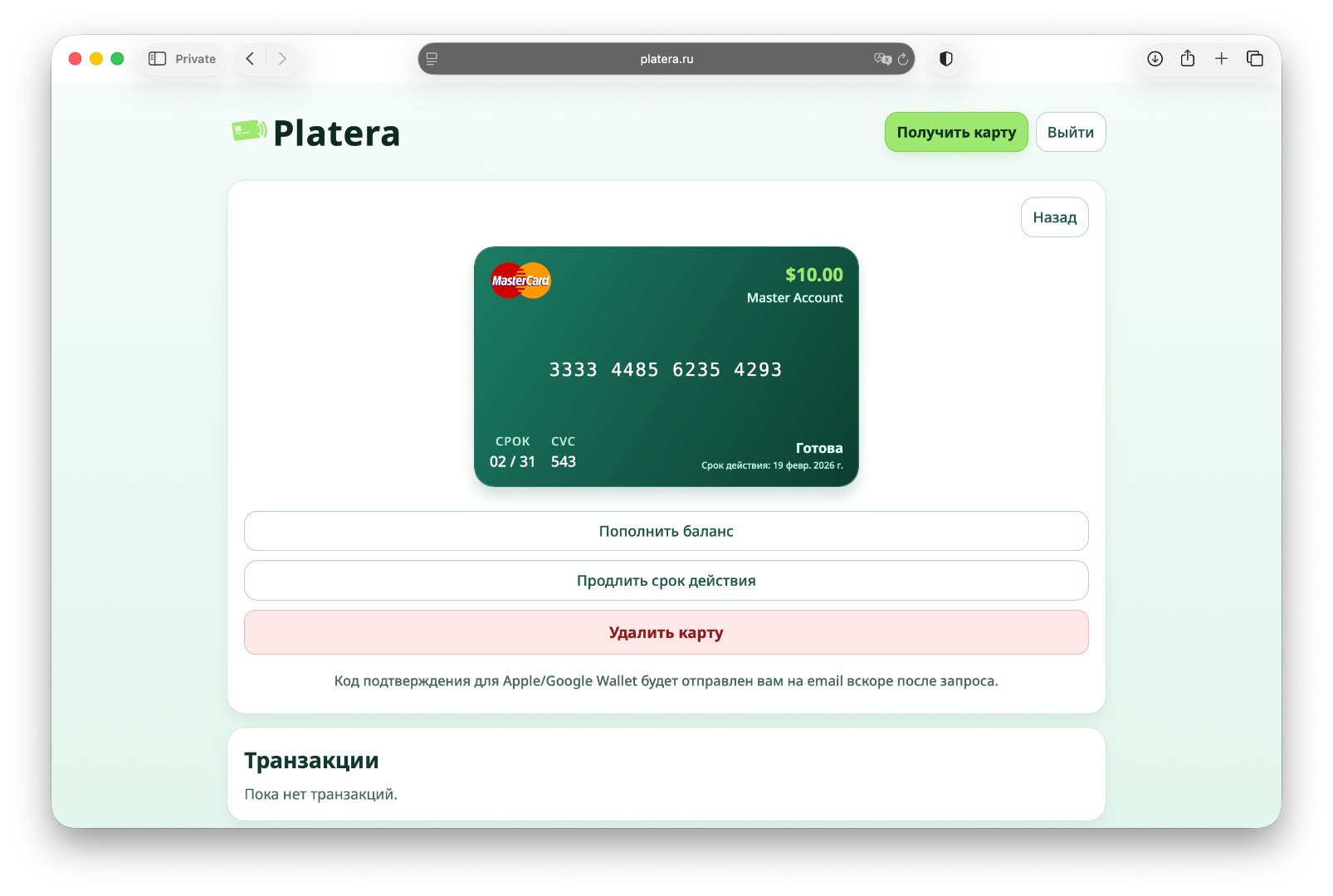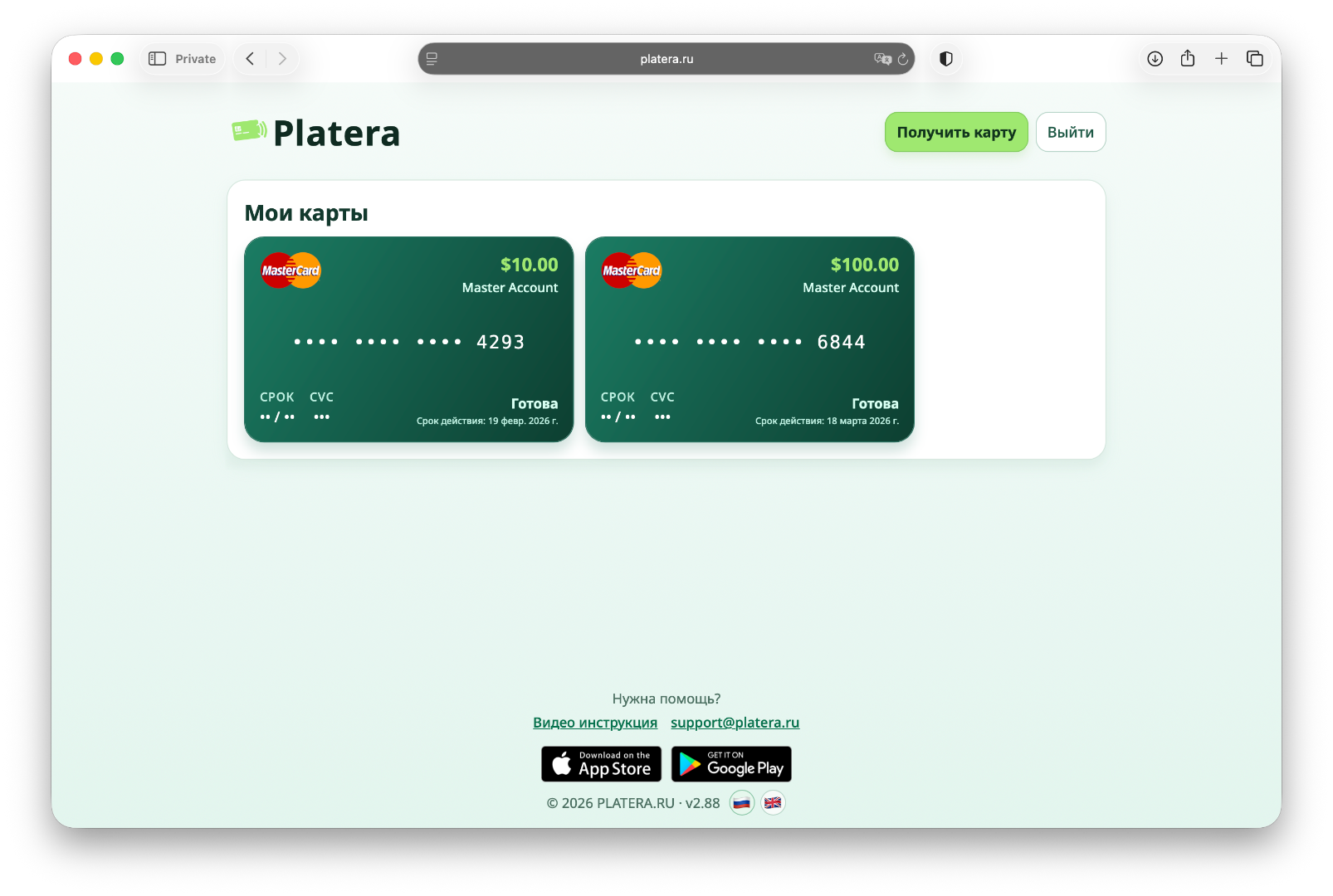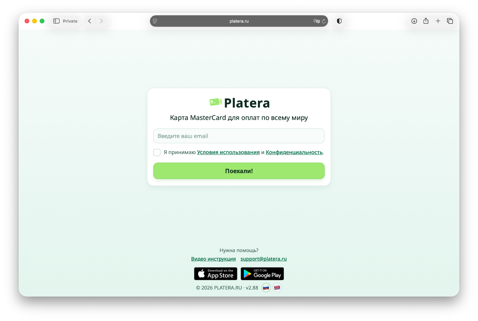 Get a virtual MasterCard, add it to Apple Wallet/Google Wallet, and pay worldwide with Platera.ru.