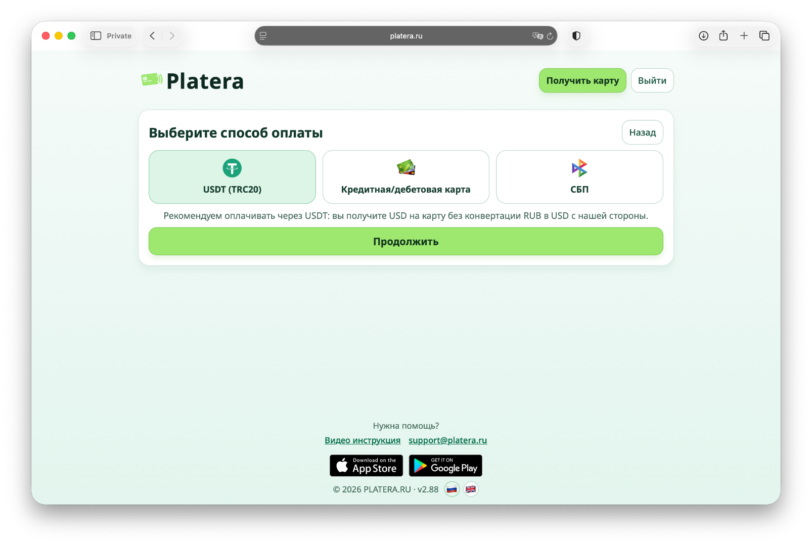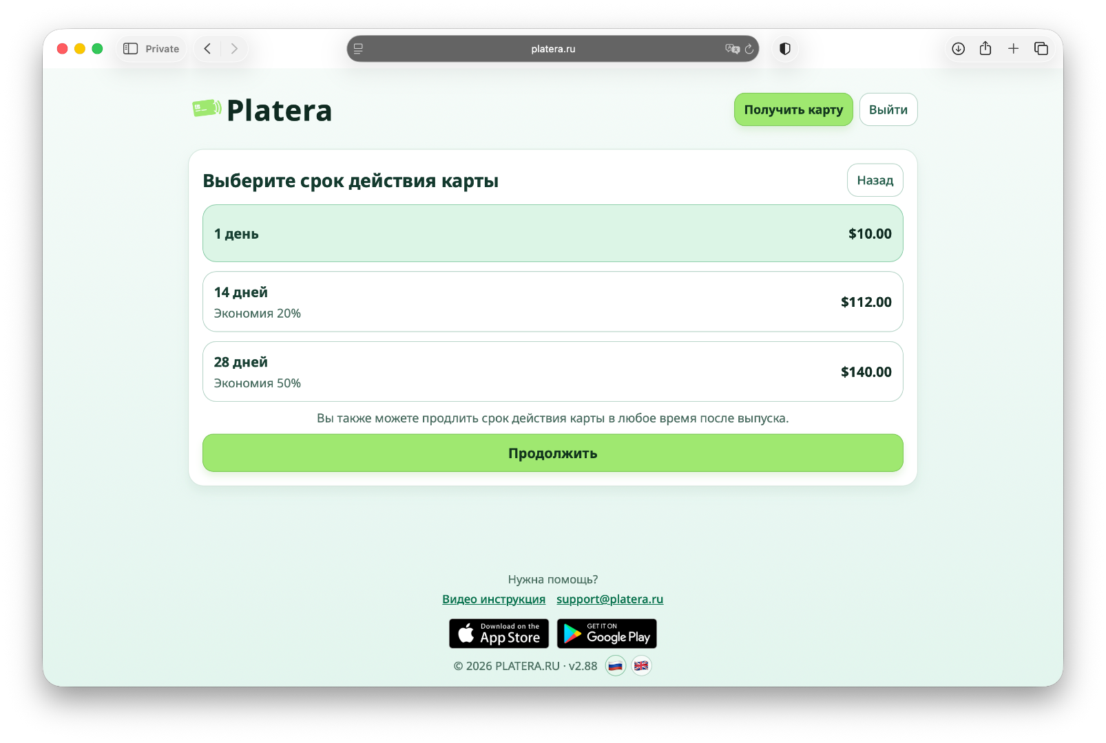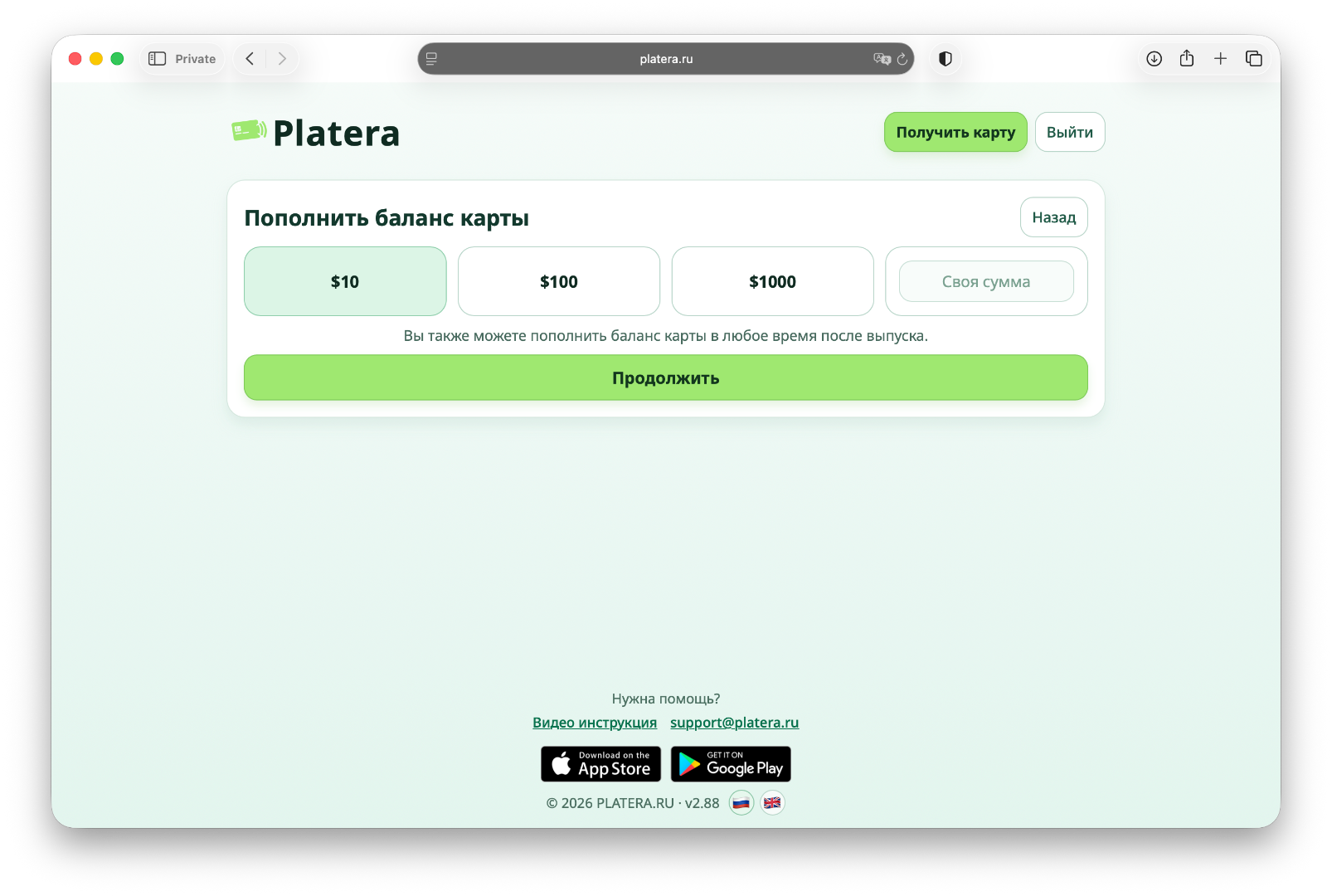 Get a virtual MasterCard, add it to Apple Wallet/Google Wallet, and pay worldwide with Platera.ru.