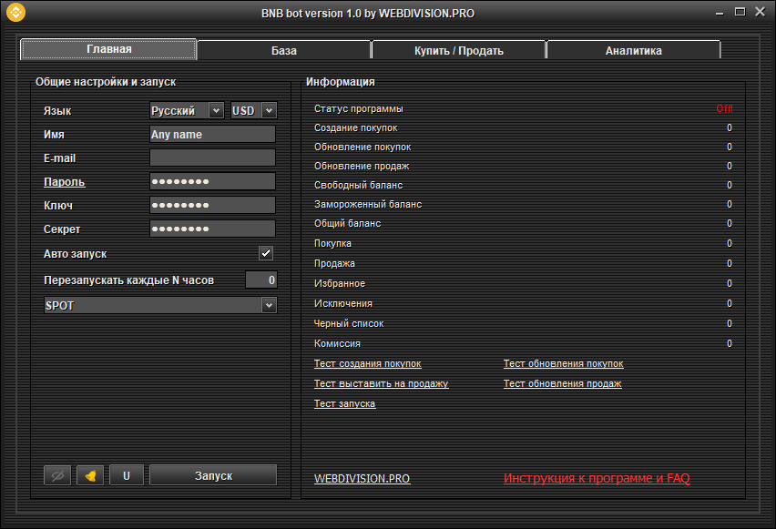 1. Большое обновление, проще прочитать инструкцию webdivision.pro/ru/manual/software/bnb-bot/