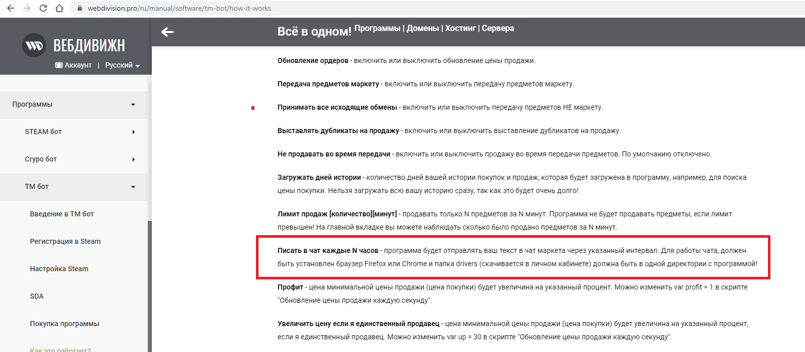 1) Нет никакой перегруженности, наоборот много «хотелок» от пользователей получаем. Непонятно как наличие бота влияет на наличие функции автоматически написать в чат с помощью бота. Программа может, например, каждый час отправлять в чат маркета ссылку на ваш инвентарь маркета — это реклама, движущая сила любого бизнеса. Программа уникальная для каждого пользователя и каждый может автоматизировать свой стиль торговли.