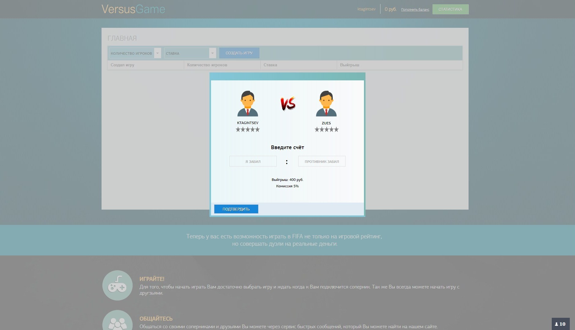 Теперь у вас есть возможность играть в FIFA не только на игровой рейтинг, но совершать дуэли на реальные деньги. Для того, чтобы начать играть Вам достаточно выбрать игру и ждать когда к Вам подключится соперник. Так же Вы всегда можете начать игру с другзьями. Общаться со своими соперниками и друзьями Вы можете через сервис быстрых сообщений, который Вы можете найти на нашем сайте. Наш сервис оснащен системой сбора статистики. Поэтому чем Вы больше выигрываете, тем выше Ваш рейтинг. Желаем удачи!