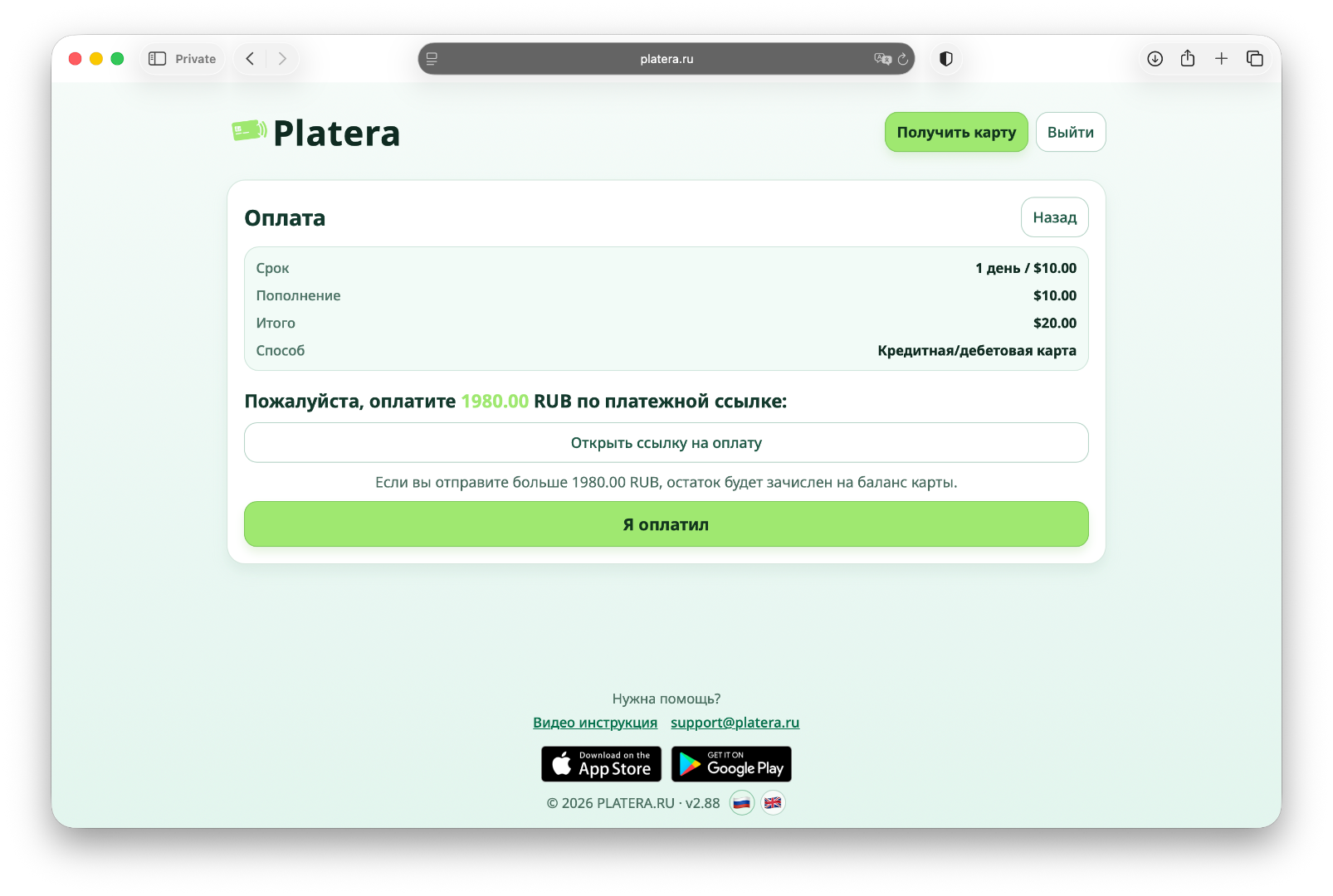 Получите виртуальную карту MasterCard, добавьте ее в Apple Wallet/Google Wallet и оплачивайте по всему миру с Platera.ru.